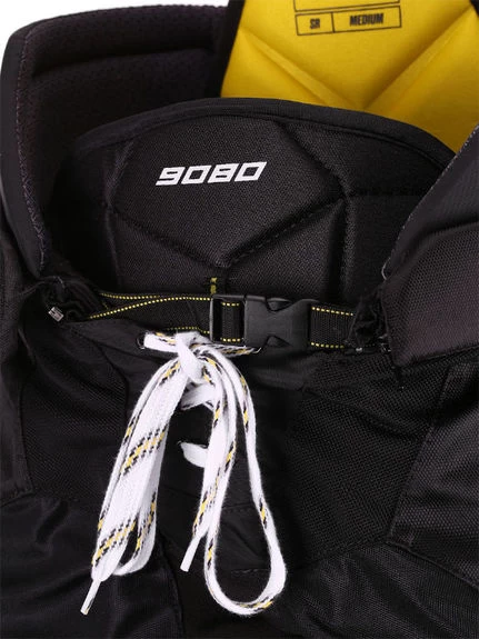 – Cuisses : Des plaques en PE (Polyéthylène) moulé doublée de mousse de densité moyenne protège de tous types d’impact. Les protèges cuisses flottent à l’intérieur de la coque pour permettre à la protection de se déplacer en fonction des mouvements du joueur.