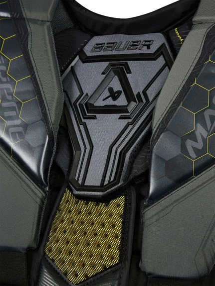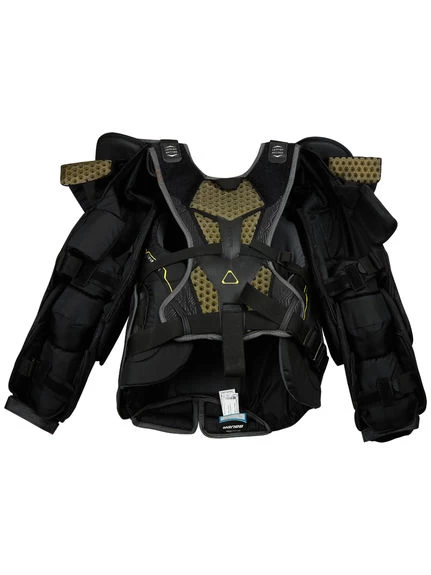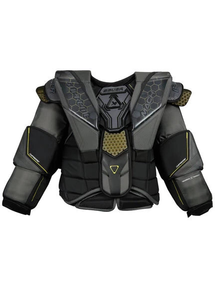 – Poitrine :. Pour une protection d’élite et des performances sur les rebonds, les bras sont dotés d’un Fused Comp avec une composition CURV pour l’avant-bras et les biceps. De même, Bauer a mis en place la mousse de contrôle du rebond dans le sternum pour une couverture et une absorption des chocs accrues.