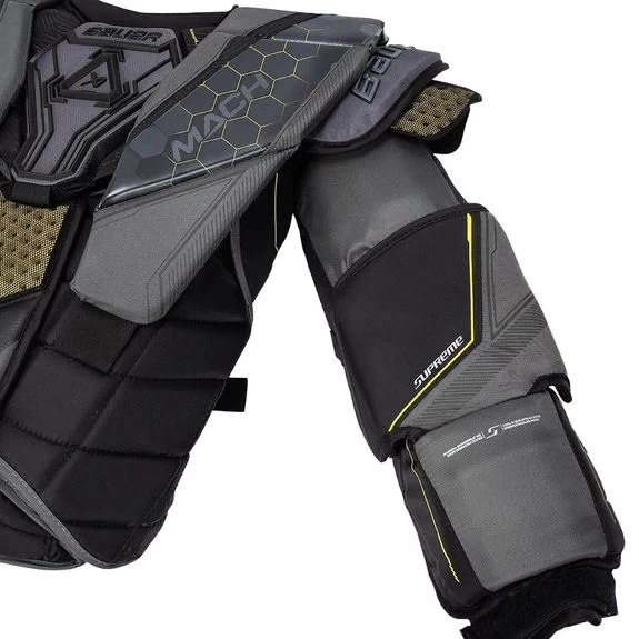 – Bras : Le plastron Supreme Mach est doté de bras réglables par velcro qui peuvent être fixés sur deux pouces de longueur (5cm), ce qui vous permettra de personnaliser les bras selon votre convenance. Bauer a mis en œuvre également sa toute nouvelle conception de bras articulé AMP 2.0.